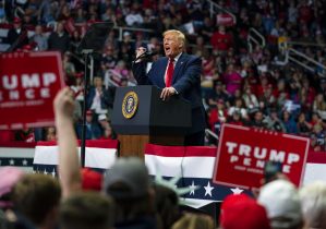 FILE – In this March 2, 2020, file photo, President Donald Trump speaks during a campaign rally at Bojangles Coliseum in Charlotte, N.C. (AP Photo/Evan Vucci, File)